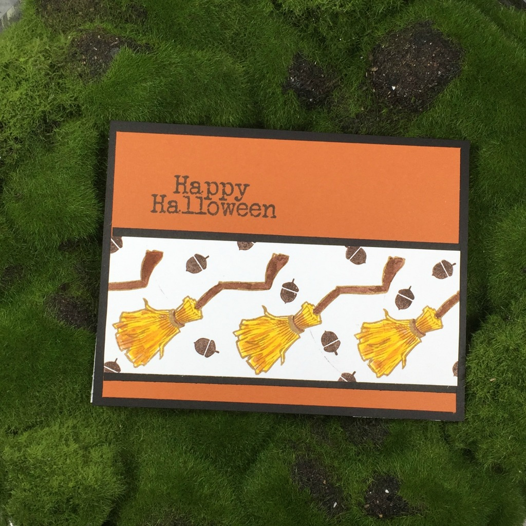 I used the cute witch's broom stamp to make a border of brooms. The brooms were stamped with Brutus Monroe Detail Ink. I colored them in using Zig markers. I did add the acorn stamp which came from the Brutus Monroe Fall Inspiration Box. Using traditional fall colors I layered the border of brooms and stamped the sentiment that came with the set above the brooms.