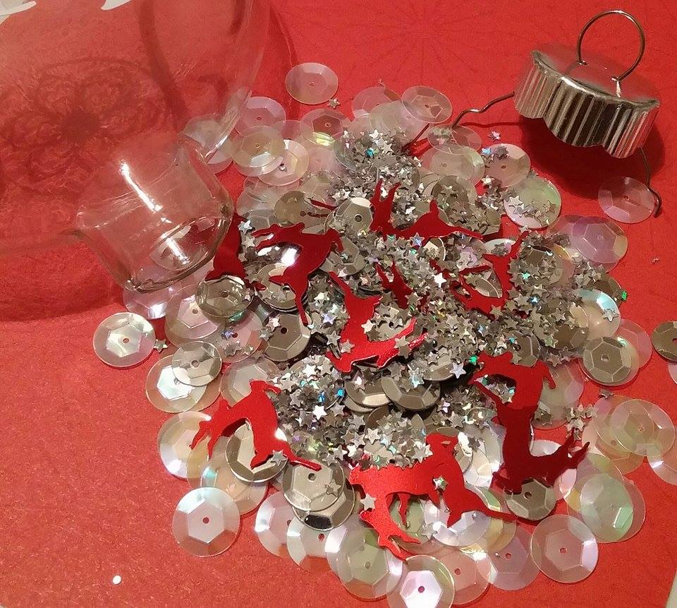 3. Pop the top off and add in whatever you'd like. I added sequins in mine. But you could add sand, fake snow, glitter, anything that fits really!!!! I used Stars, Reindeer, and different sized Sequin cups. I added black stars and sequins after because I found a black nylon ribbon I wanted to use.