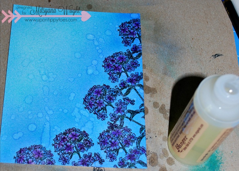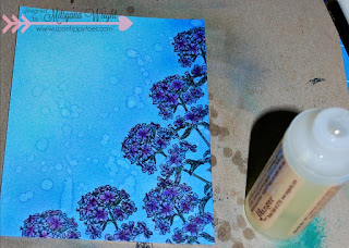 Sfter I got the desired look to my flowers that I wanted I splashed and splattered Alcohol blending solution onto the background. The alcohol reacts with the markers and gives a splattered bleach effect.