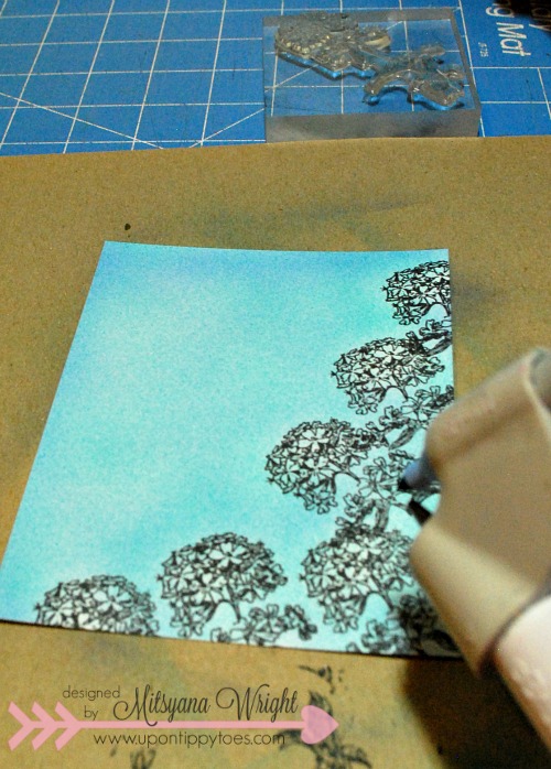 First, I stamped my hydrangea flower image from the "Bru/Mo" Botanical Sentiments I set multiple times onto smooth white cardstock. I overlapped the images in some areas to make it look like how hydrangeas naturally grow, bundled together like a bush/shrub.