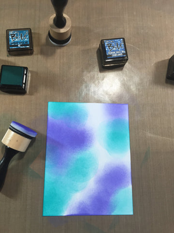 Step 1 - use 1/4 sheet of alabaster card stock blending Oz, Cornflower and Aubergine ink