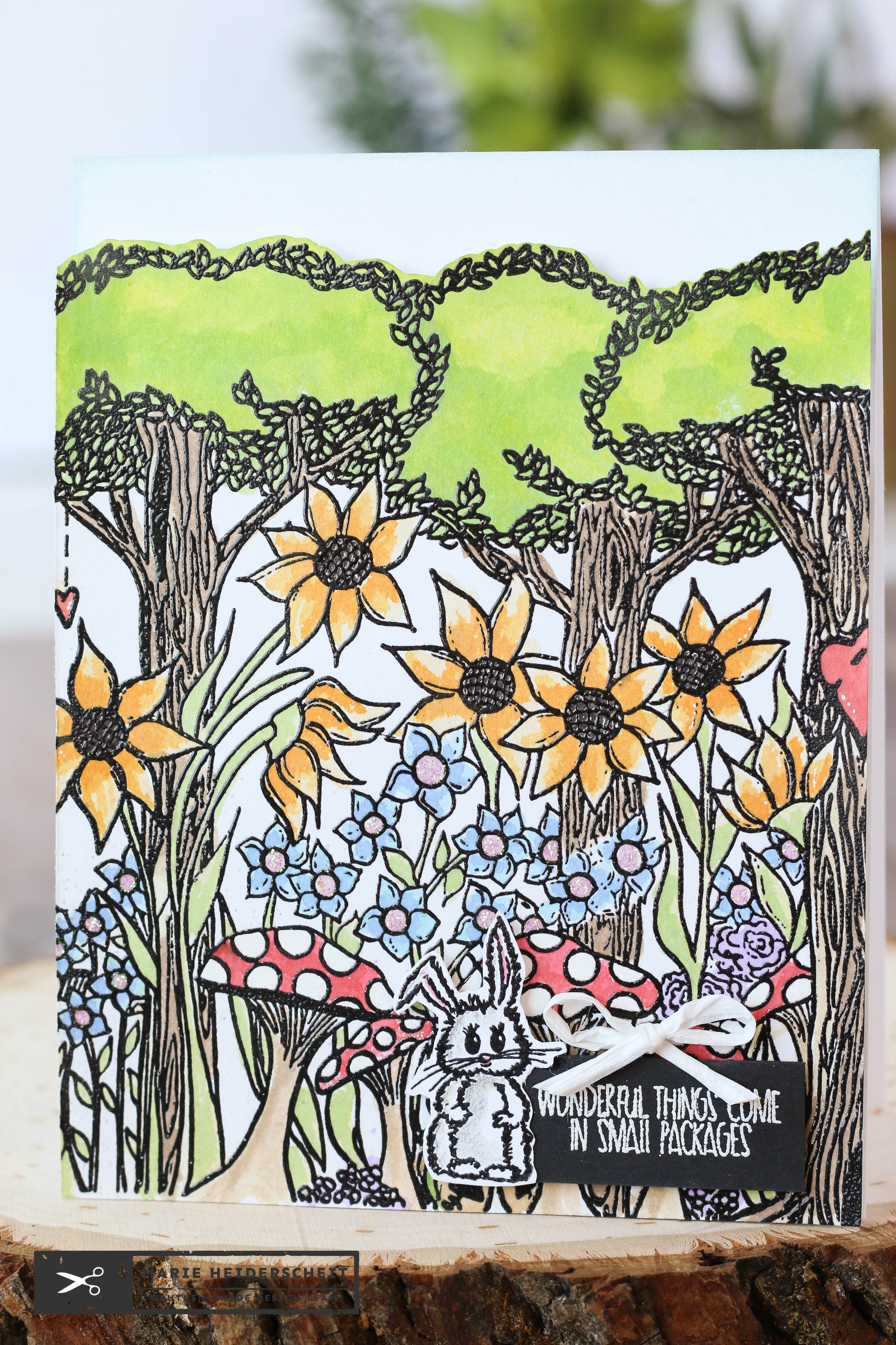 This first card I created I combined both the sets, but focused mostly on the FAIRY GARDEN BACKGROUND stamp. I used my Misti to stamp this image and then embossed it in RAVEN EMBOSSING POWDER. I planned on watercoloring and embossing the lines always helps me get cleaner results. After the image was embossed, I watercolored it using a variety of Distress Inks. Then, I cut the image down to an A2 card size, and trimmed along the tops of the trees, as well. Then, I adhered the image to the front of a white card base using some kids craft foam to add dimension.