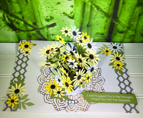 We used the Karen Burniston step by step video instructions to create this breath taking flower pot pop-up card center. Karen's instructions make this complicated and beautiful flower arrangement easy to create. The hardest part is to decide when to stop adding flowers.
