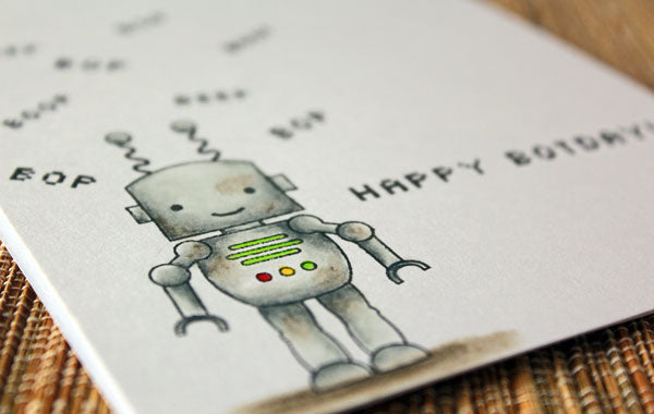 A very simple card for today, I played with 'Beep Bop' stamp set. This cute robot and all the sentiments are stamped on a white cardstock using Raven Detail ink and then I colored the image with Prisma color pencils.