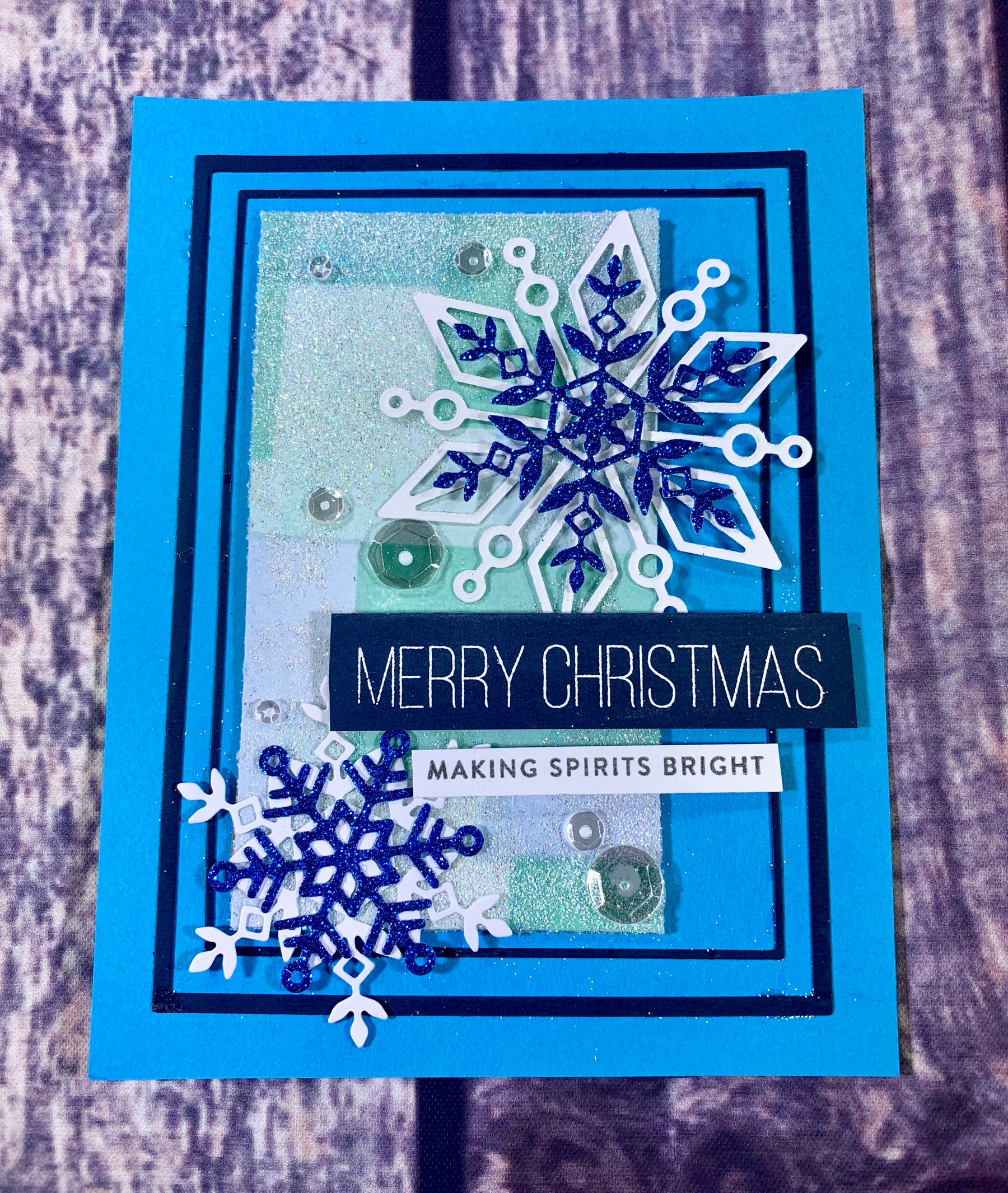 I made this card for a favorite YouTube personality of mine. The background was made using the Basic Shapes stamp set from the Brutus Monroe Stamp Club. Then the background was coated with Brutus Monroe Glitter Glaze - Fallen Snow to add a little more ice to the card. The snow flakes were die cuts out of Not Your Momma's white card stock and bright blue Glitter Paper both from Brutus Monroe.