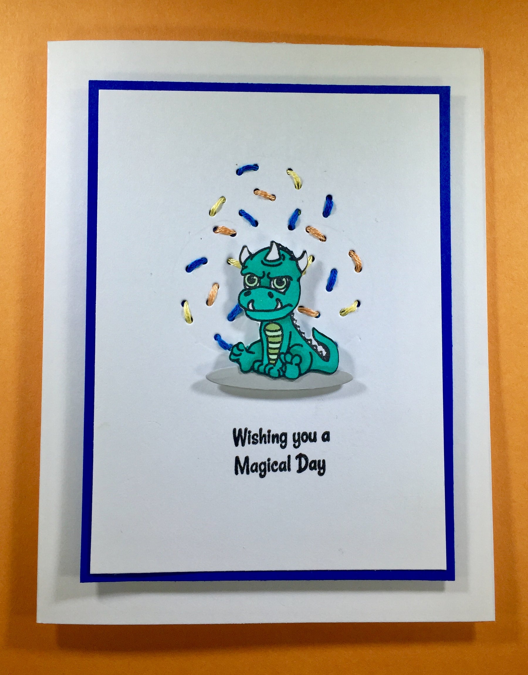 This little guy is so stinking cute I couldn't help but choose him to be my focal point of this birthday card. He was colored in using Style File markers then scan and cut out. He was placed on a gray shadow oval to anchor him on the card. (This was done so the dragon did not appear to be floating on the card.)The card layer that the dragon was attached to was first stamped with one of the sentiments from the stamp set. Next using a punch many holes were added to the area the dragon would be attached. Using various colors of embroidery thread the holes were used to create confetti to surround the dragon's head. (Does this remind anyone of the old sewing cards from yesteryear?) The dragon was then attached with foam tape.