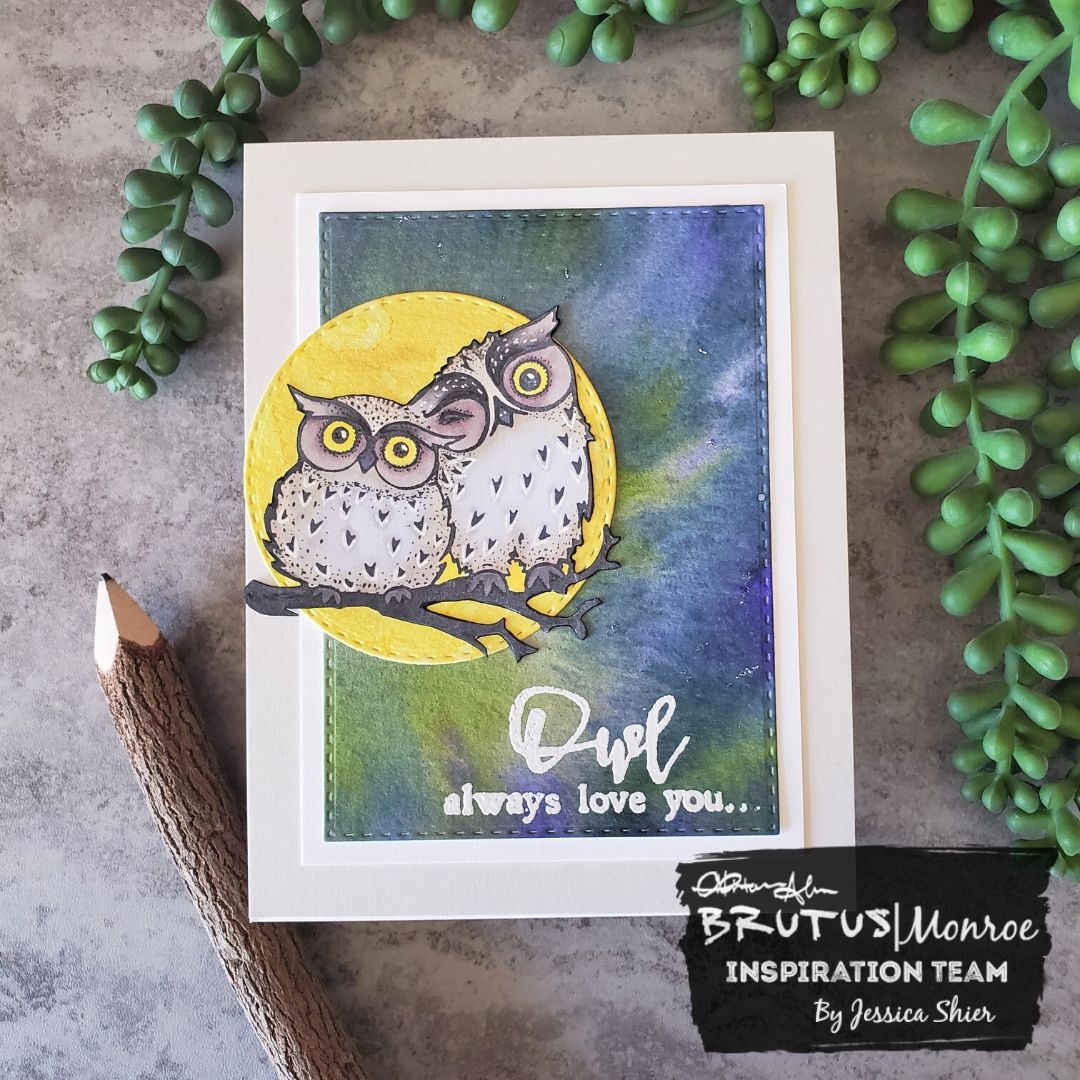 I layered a piece of Sidewalk card stock over top of a A2 cardbase then added a layer of Alabaster card stock. Now I can adhere the watercolor background, the yellow Aqua pigment moon and my fussy cut owls.