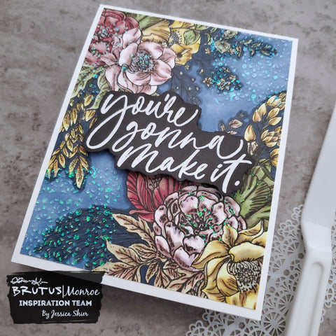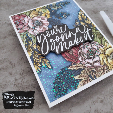 I set the panel aside to dry then heat embossed the sentiment. I decided to use the lovely sentiment "You're gonna make it." Those are words that I can use for cards and send to others quite frequently through out the year. Great for encouragement cards. I used Alabaster embossing powder on top of the Raven card stock. I also fussy cut the sentiment down and used some dimensional adhesive foam to pop it up in the center of the floral panel.