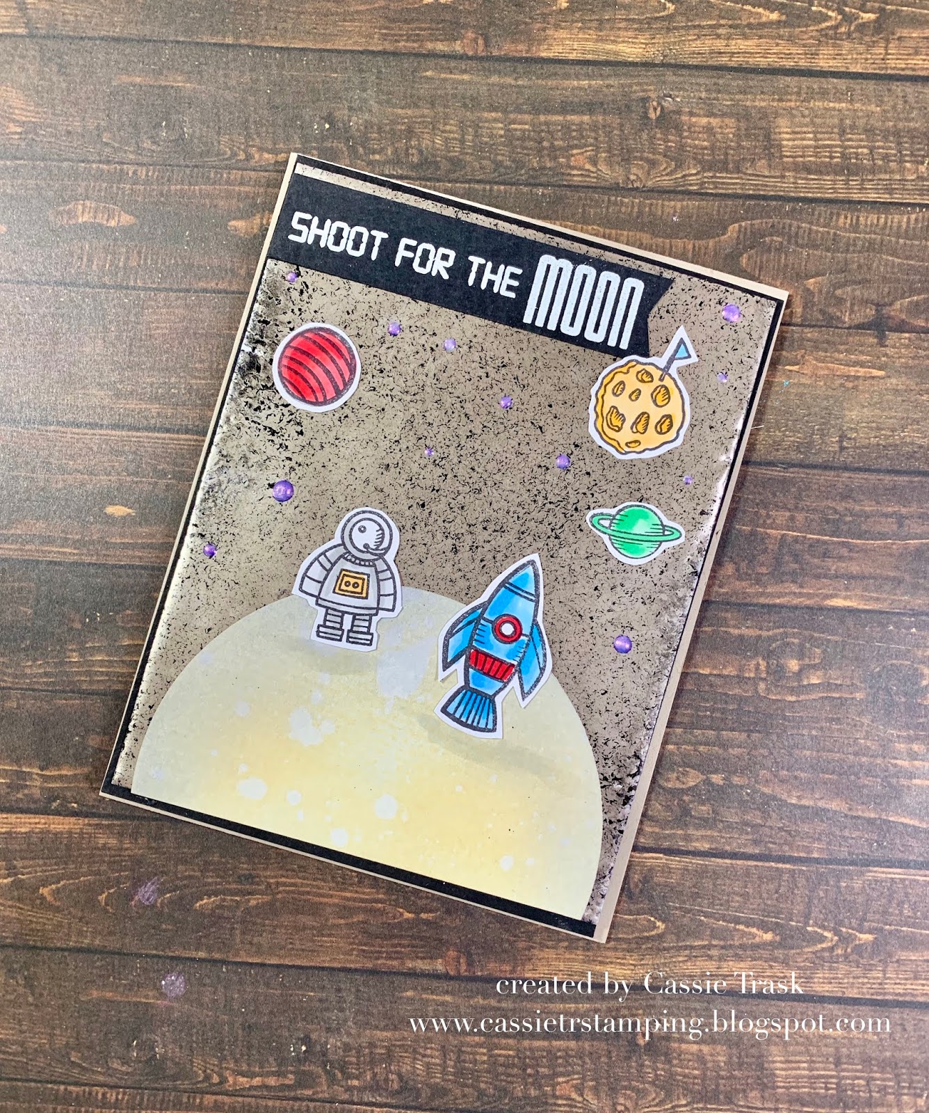 My images were stamped onto to some XPress It Cardstock with Memento Tuxedo Black ink, and then colored with alcohol markers. I fussy cut them out and then began to assemble my card. My galaxy was adhered to a slightly larger piece of black cardstock and then the whole panel was adhered to a piece of kraft cardstock. Once my card was fully assembled, I finished it off by adding a few Nuvo Dream Drops in the color Cloud 9.