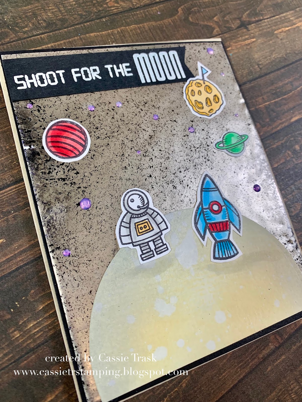 My first project for the month uses the Brutus Monroe Outer Space stamp set along with the Brutus Monroe Milky Way embossing powder. To create my background I used a piece of Canson XL watercolor paper cut down to 4" x 5 1/4". I covered that panel with Versamark Ink and then poured the Milky Way embossing powder all over the panel. I heat that with my heat tool until it was smooth and melted. When it was cool, I started that whole process over again, so that I could get the powder nice and thick. I think it gives the background this illusion that the moon is actually glowing, and I love that.