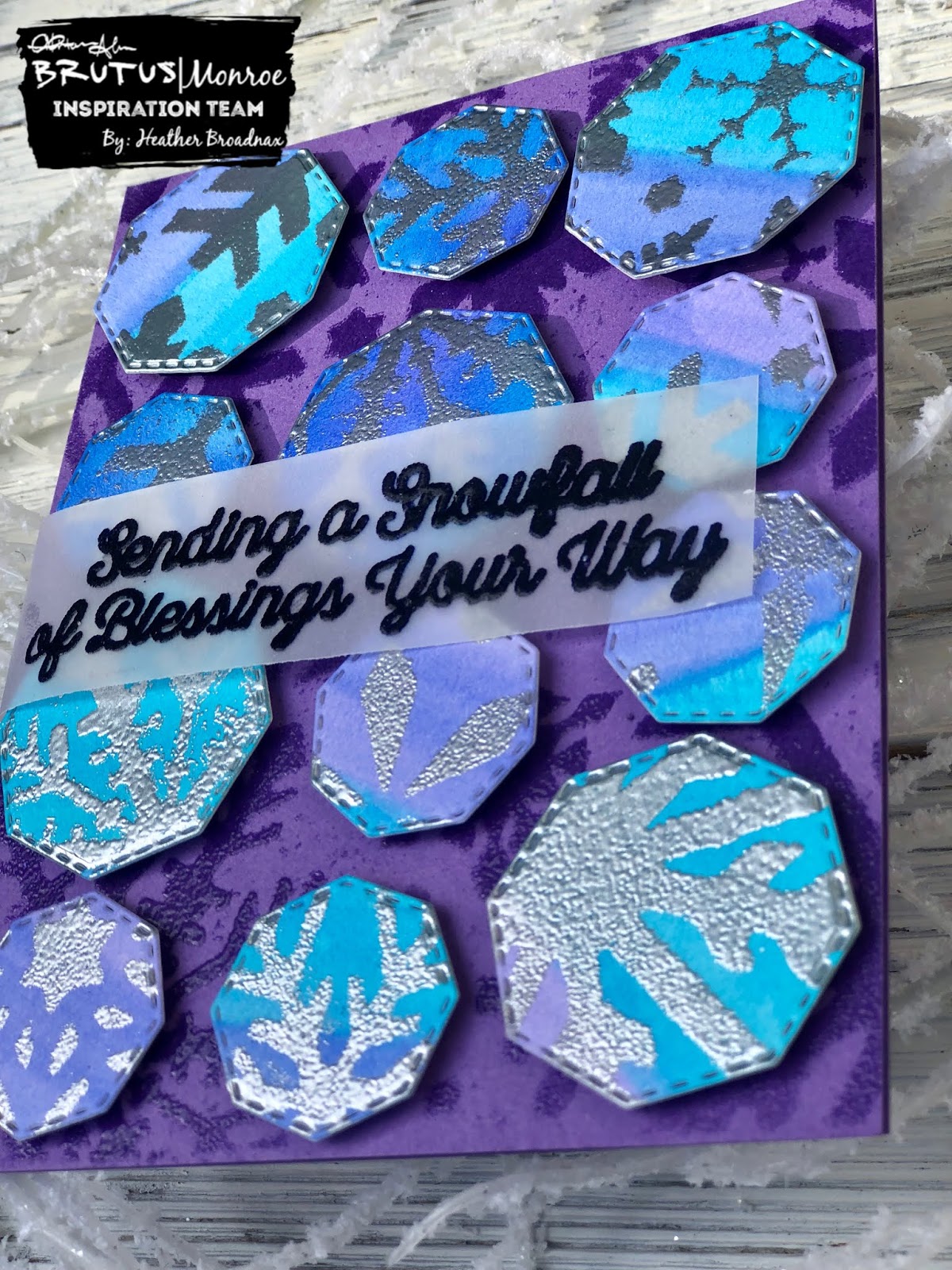 Next, I created the panels that were used to cut the hexagon shapes. The panel was used by adding generous amounts of water to a piece of watercolor paper and then dropping blue violet and turquoise Aqua Pigments onto the paper and moving them around until I got the desired look. Once it had dried, the same technique using the snowflake stencil that was used for the base on the aqua pigment panel except this time it was coated in Sterling embossing powder. I love the gorgeous silver and shine that you get from the Sterling embossing powder.