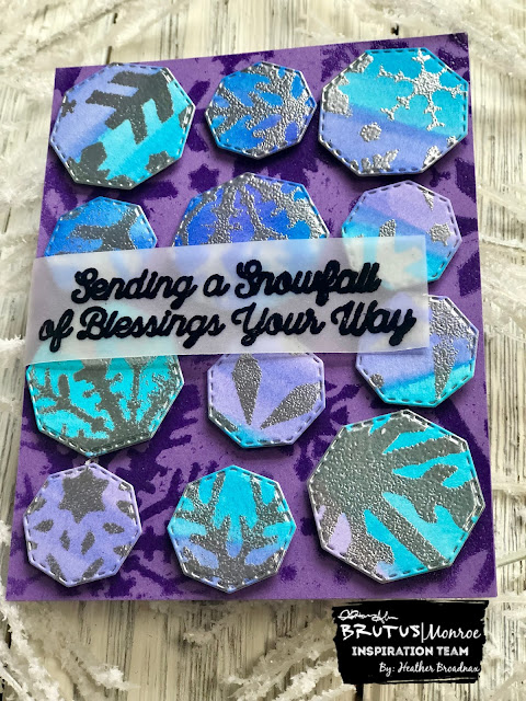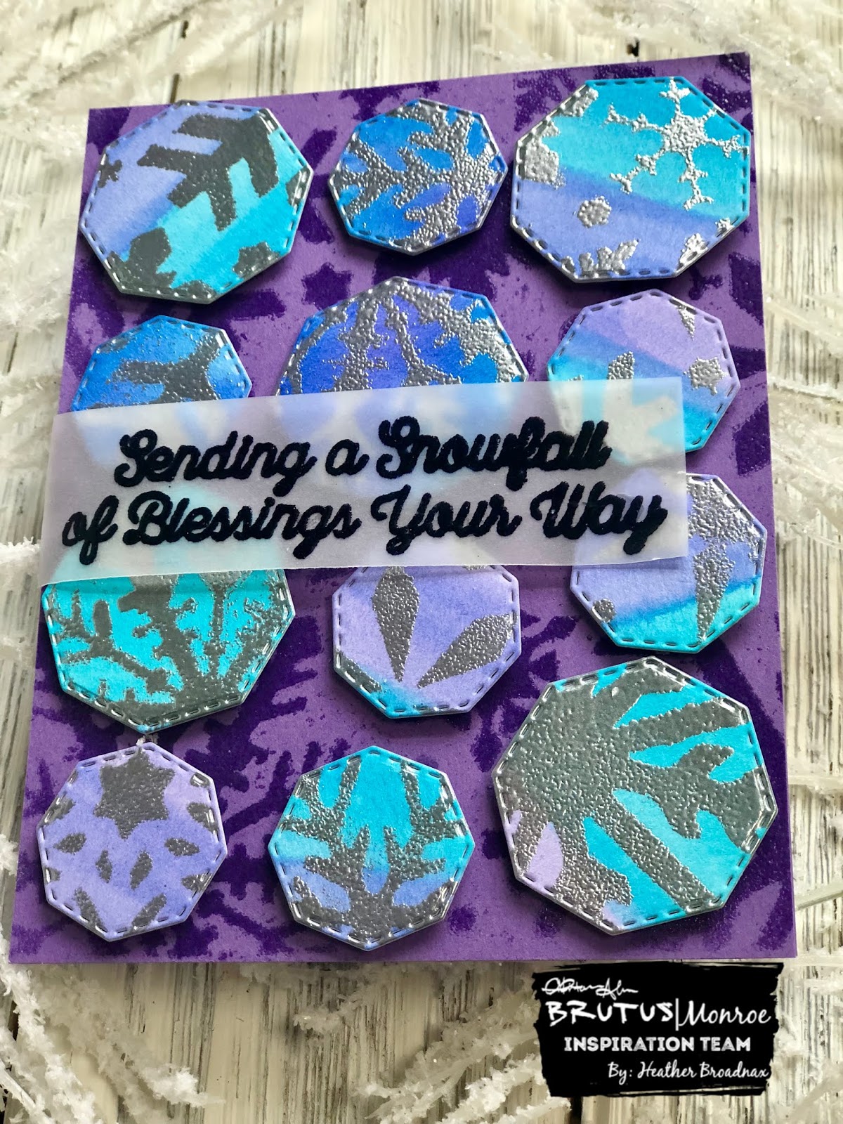 Hello! As the last leaves fall from the trees the empty branches will soon be draped with beautiful blankets of snow. Heather B. here today to share a card with you that shows the beauty of snow in purples and blues using heat embossing, die cutting and aqua pigments.