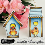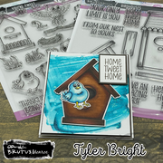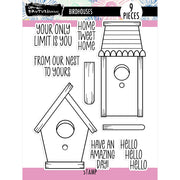This 9 piece birdhouse stamp set includes 2 birdhouses and a variety of sentiments. Illustrated by Emily Goff.