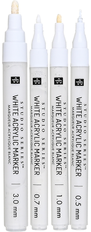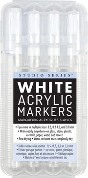 Quick-drying opaque white paint markers produce vibrant effects on both dark and light surfaces! White paint markers work on all kinds of surfaces! Glass, stone, plastic, ceramics, paper, wood, and more! Perfect for arts and crafts of all types! Tips come in multiple sizes for maximum versatility: 0.5, 0.7, 1.0, and 3.0 mm. Fine-line to bold! Seamless flow of paint provides a flawless experience. Premium opaque white paint is water-resistant once completely dry. How to use: Gently shake marker. Uncap. Press tip down against surface until paint flows to tip, then draw. Recap marker right away when finished. Set of 4 white acrylic paint markers. Reusable case safeguards markers when not in use. Enjoy effortless writing, drawing, and crafting with quick-drying white paint!