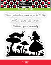 Dive into whimsical fun with the Cheshire Adventure 4x4 stamp set, featuring four silhouette stamps of Alice chatting with a storybook friend. Perfect for papercrafting, these playful images and charming sentiments bring a touch of magic to your cards and projects. Let your creativity wander down the rabbit hole with this delightful collection!