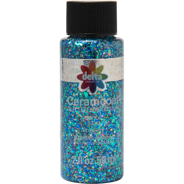 The Delta Ceramcoat Glitter Explosion - Tropical is the perfect sparkling finish that will give your project a blinding sheen. This shimmering formula has multiple sizes of glitter suspended in a crystal clear base. Use on wood, metal, glass, canvas, paper, and so much more. Delta Ceramcoat Glitter Explosion is water-based for the best painting experience. With a layer of Delta Glitter Explosion, your projects will have a striking shine that is hard to miss.