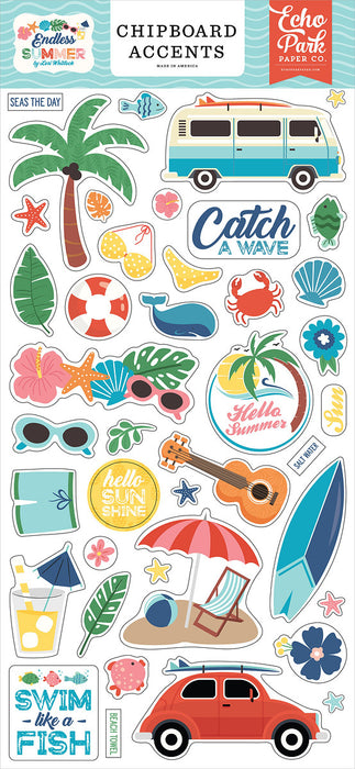 Elevate your crafting projects with these cool endless summer chipboard accents. Perfect for adding a pop of fun to your summer-themed crafts! Get ready to add some sunshine to your creations.