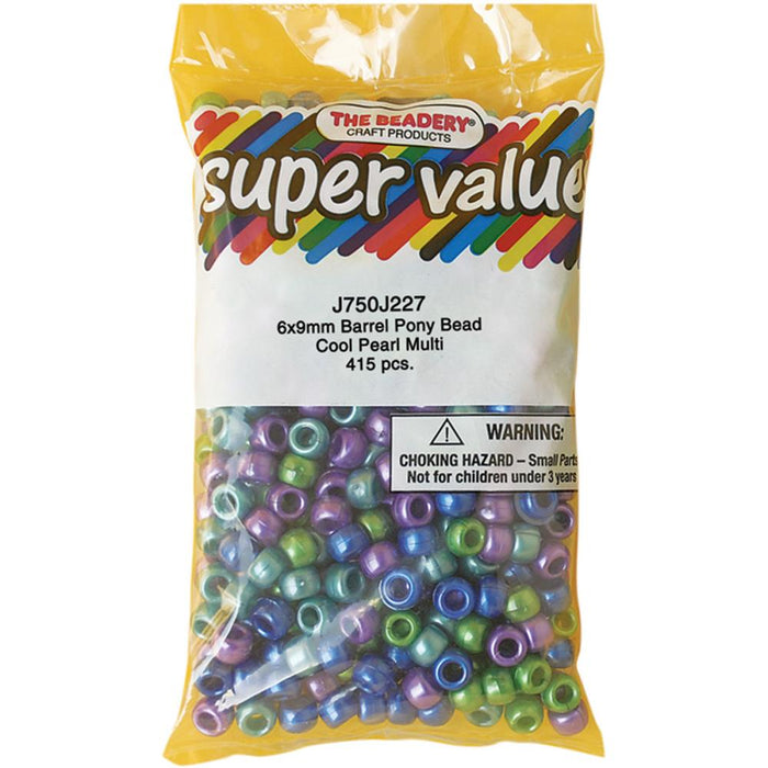 THE BEADERY-Super Value Pony Beads: 6x9mm Barrel Beads. Beautiful beads in a multitude of colors. Whether you plan on using them for hair, jewelry, adornments on clothing, lamp shades or curtains they will surely brighten up your world. Approximately 415 pieces per package. Available in a variety of color combinations: each sold separately. Choking Hazard-small parts. Not for children under 3 years.