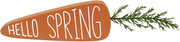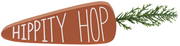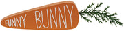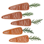 The carrots have textured leafy green tops and white painted lettering, reading “Hippity Hop”, “Bunny Trail”, “Hello Spring”, “Funny Bunny”, or “Egg Hunt”. The carrots display freestanding on their sides, ideal for accenting a tray, tabletop, or shelf during the spring season. Each carrot measures 2” high by 9.5” wide by .75” deep.